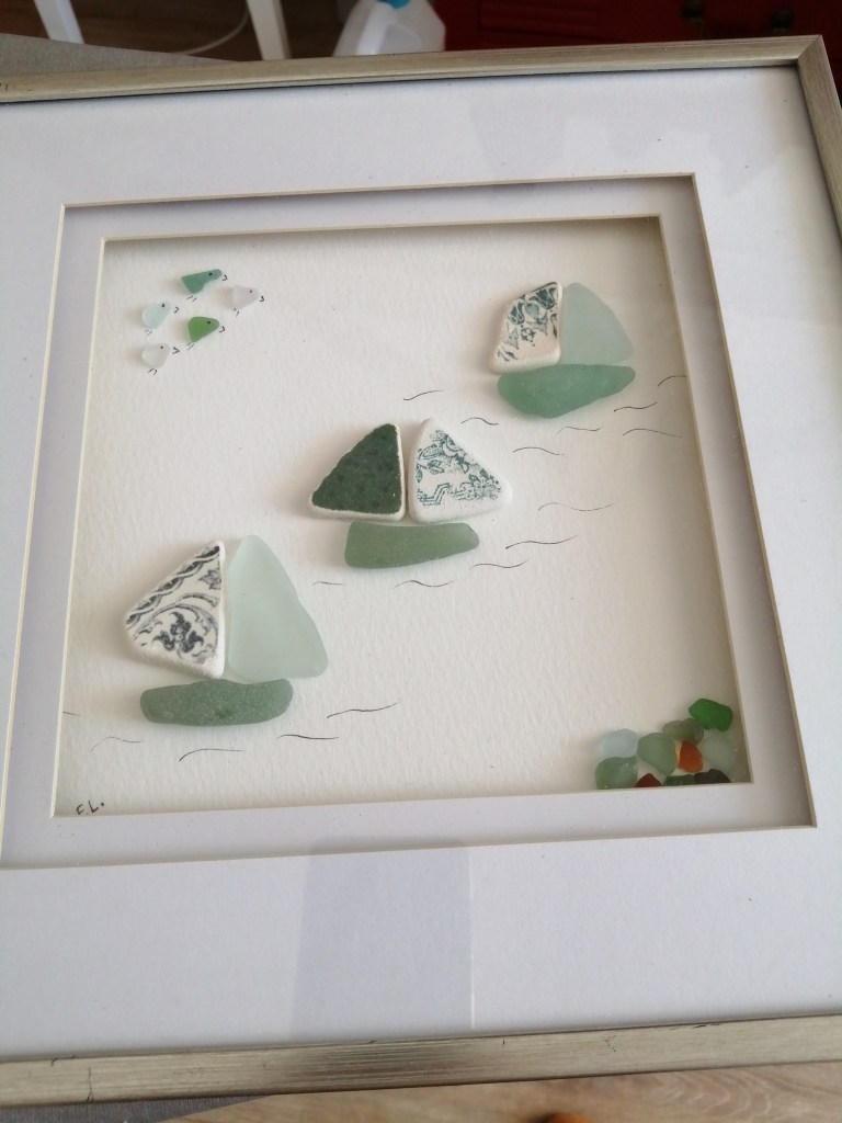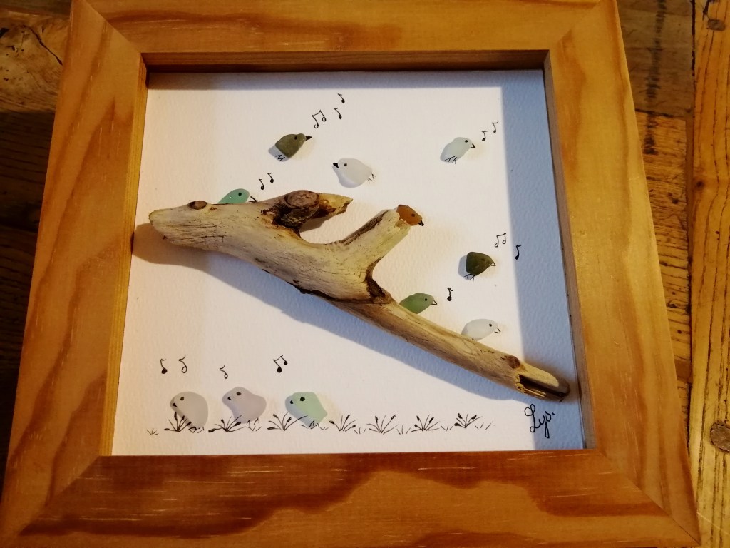 Autodidacte depuis quelques années, je crée des tableaux avec les trésors de plage…verre poli, céramique cassée, coquillage et bois flotté..